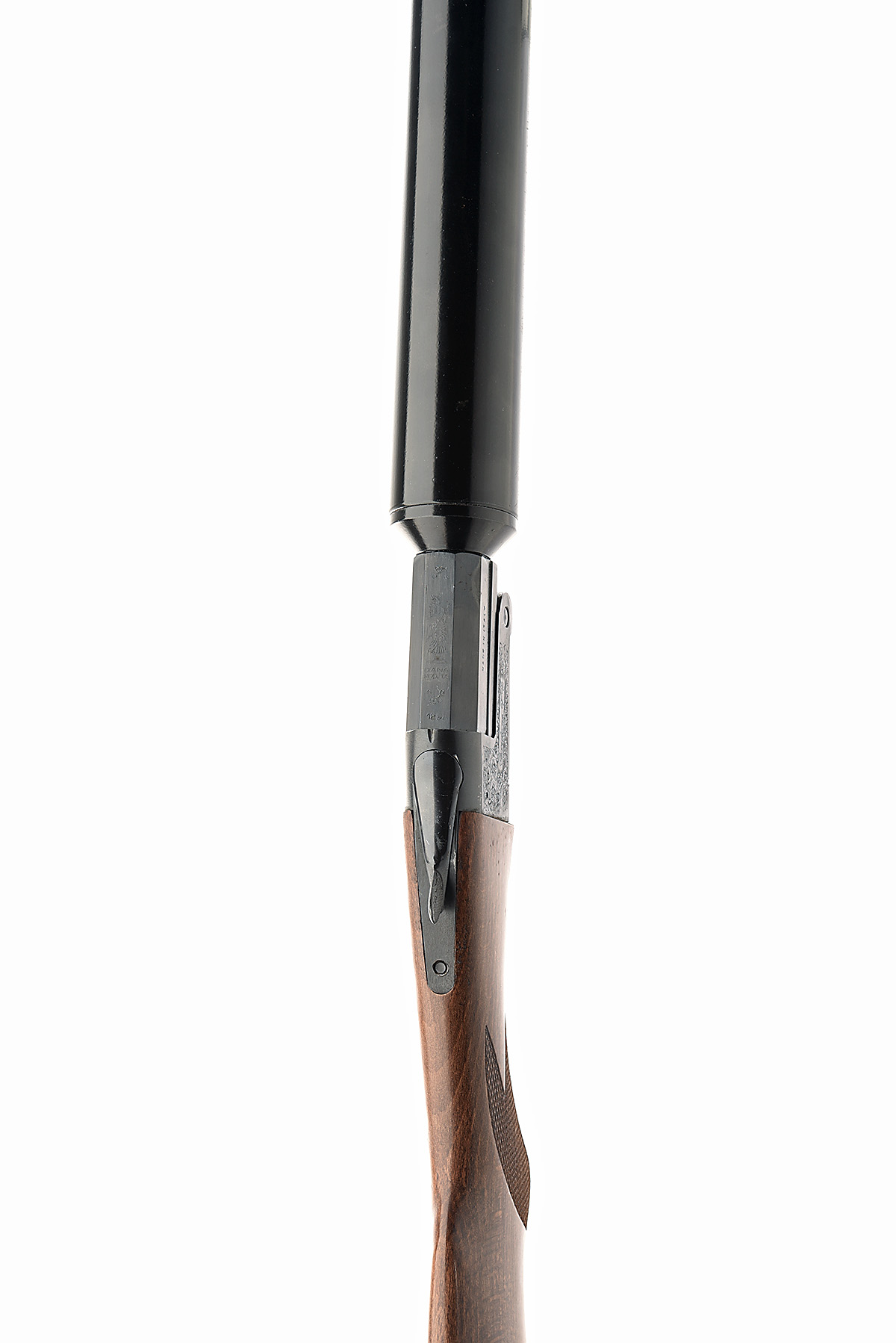 ENRICO PEDRETTI 12-BORE 'DIANA MOD.105 - GUNSPORT HUSHPOWER' SINGLE-BARRELLED MODERATED SHOTGUN, serial no. 973, for 1996, 31 1/2in. (80cm) nitro barrel including sound moderator, 2 3/4in. chamber, manual push-button safety, blacked action with acanthus scroll engraving, 14 1/4in. semi-pistolgrip stock including buttplate