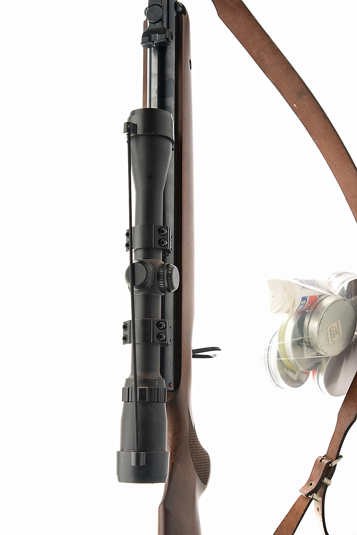 A .177 BREAK-BARREL AIR-RIFLE, SIGNED WEIHRAUCH 'MODEL HW95', serial no. 2017155, 16in. barrel, front sight removed, adjustable open rear sight, air chamber fitted with a Bushnell Elite 3200 telescopic sight, manual safety, chequered pistolgrip halfstock, 14 1/4in. pull including rubber recoil pad, leather sling, together with several tins of pellets