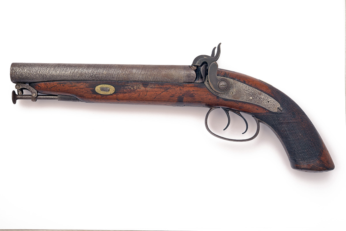A 16-BORE PERCUSSION DOUBLE-BARRELLED HOWDAH-PISTOL, UNSIGNED, no visible serial number, circa 1845, with side by side 8 1/2in. barrels, borderline engraved back-action locks, walnut full-stock with chequered grip and stirrup rammer (stirrup as found), exposed iron surfaces shallow pitted