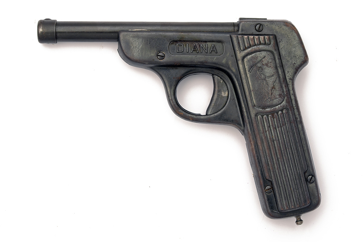 A SCARCE .177 DIANA MODEL '1' TINPLATE AIR-PISTOL, no visible serial number, circa 1930, with tip-down smooth-bore 5 3/4in. barrel, pressed tin-plate blued frame marked 'DIANA' in raised letters in a panel above the trigger, integral ribbed grips stamped with the 'Diana Huntress' trademark, cocking rod protruding at heel and guarded trigger, strong amount of finish remaining and complete with its cocking tool