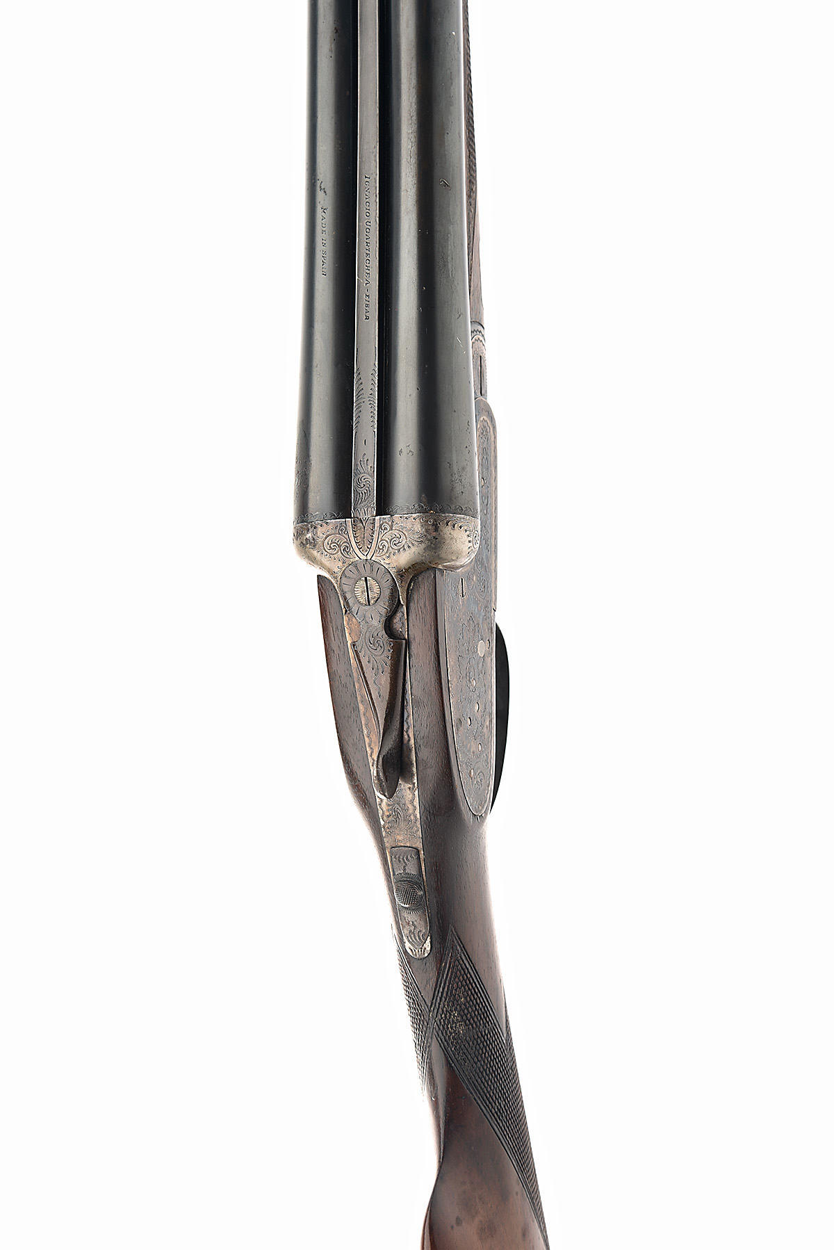 IGNACIO UGARTECHEA 12-BORE SIDELOCK EJECTOR, serial no. 72047, for 1968, 27 3/4in. nitro chopperlump barrels, 2 3/4in. chambers, bored approx. 1/4 choke in both, treble-grip action with hidden third-bite, removable striker discs, automatic safety, articulated front trigger, border, acanthus scroll and floral bouquet engraving, retaining some colour-hardening and finish, 15in. stock including 1 1/2in. wooden extension