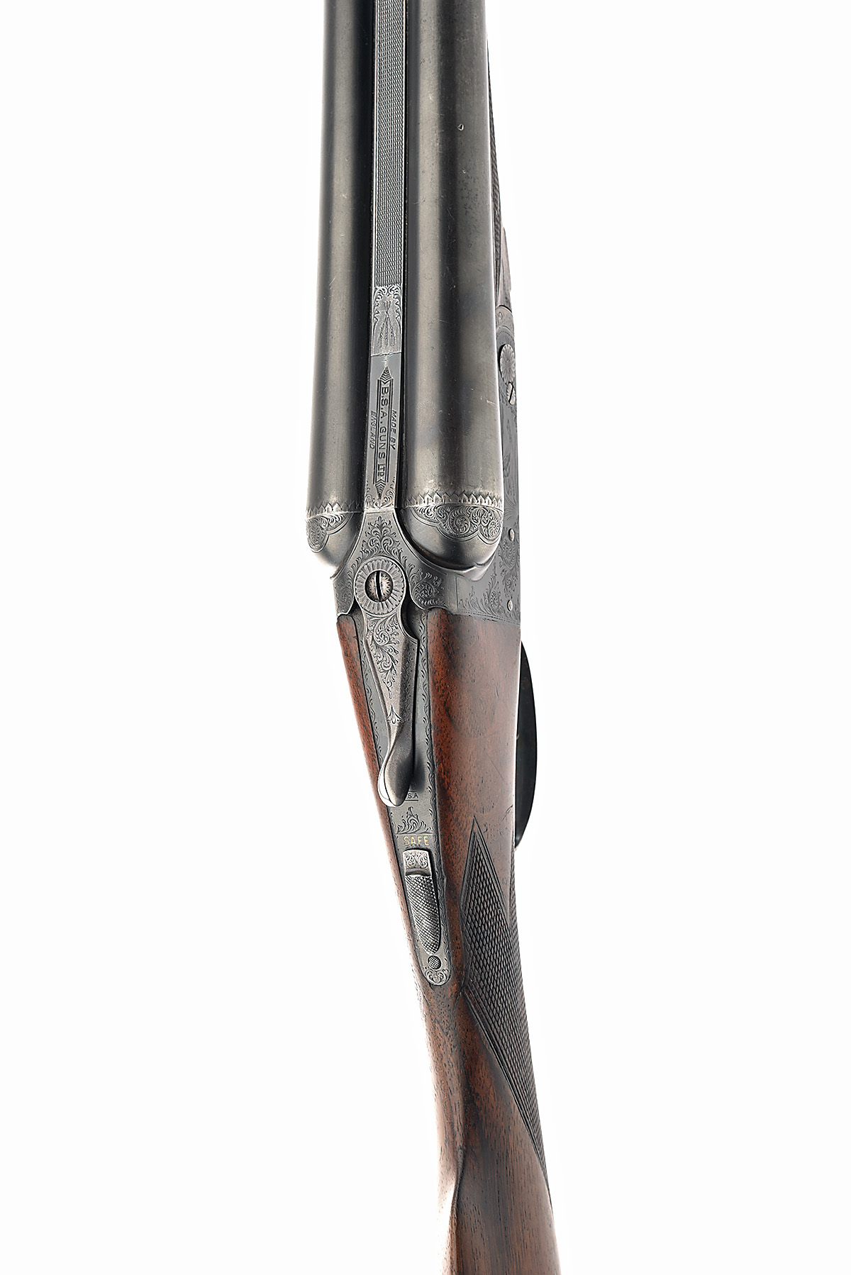 BSA GUNS LTD. 12-BORE 'DELUXE' BOXLOCK EJECTOR, serial no. 40011, circa 1935, 28in. nitro barrels (loose), 2 1/2in. chambers, bored approx. true cyl. and 3/4 choke, automatic safety with gold-inlaid 'SAFE' detail, acanthus scroll engraving surrounding scenes of duck in flight, blacked finish, 14 1/4in. figured stock (slight cast on for the left hand), weight 6lb. 10oz.