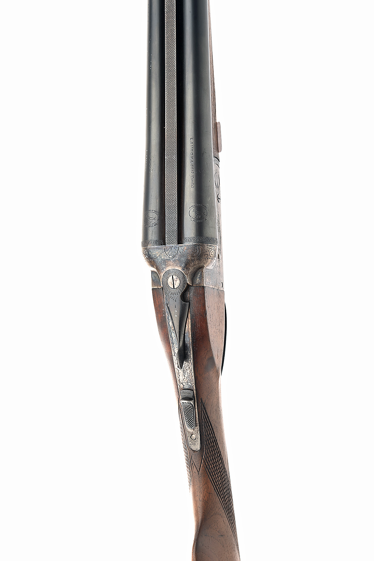 LAURONA 20-BORE BOXLOCK EJECTOR, serial no. 117380, for 1973, 27 1/2in. nitro barrels (loose), 2 3/4in. chambers, bored approx. 1/4 and 1/2 choke, automatic safety, bolstered treble-grip action with hidden third bite, removable striker discs, border and floral engraving, retaining traces of colour-hardening and finish, 14 1/4in. stock including buttplate