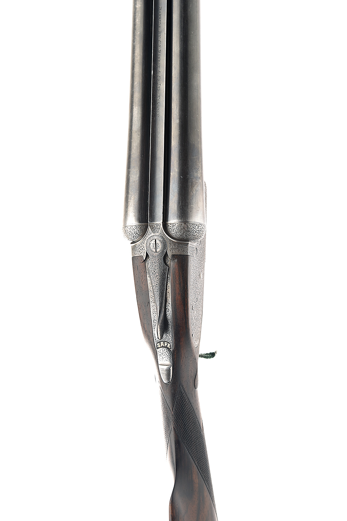 FREDc. T. BAKER 12-BORE SIDELOCK EJECTOR, serial no. 7181, circa 1905, 28in. replacement nitro barrels, rib engraved 'BARRELS BY C.S. ROSSON & CO. LTD. NORWICH', 2 1/2in. chambers, bored approx. 1/4 and 3/4 choke, carved fences, automatic safety with gold-inlaid 'SAFE' detail, right firing mechanism requires attention (mainspring detached), profusely engraved with fine acanthus scrollwork, the underside with the F.T. Baker trademark roundel, 16 7/8in. figured stock including 2 7/8in. wooden extension, weight 7lb.