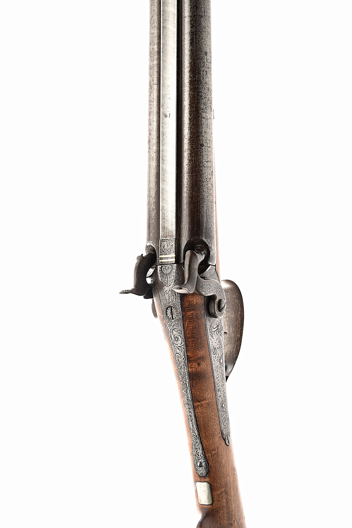 A 12-BORE PERCUSSION DOUBLE BARRELLED SPORTING GUN BY STIRLING, CIRCA 1850, no visible number, 28 in. skelp twist barrels with two inset gold lines at breech and engraved with gamebirds, foliate engraved long fixed breech tang, borderline engraved back-action locks also attractively decorated with gamebird and hunting scenes, half stocked in maple with engraved iron mounts, worn overall, top rammer pipe and rod missing.