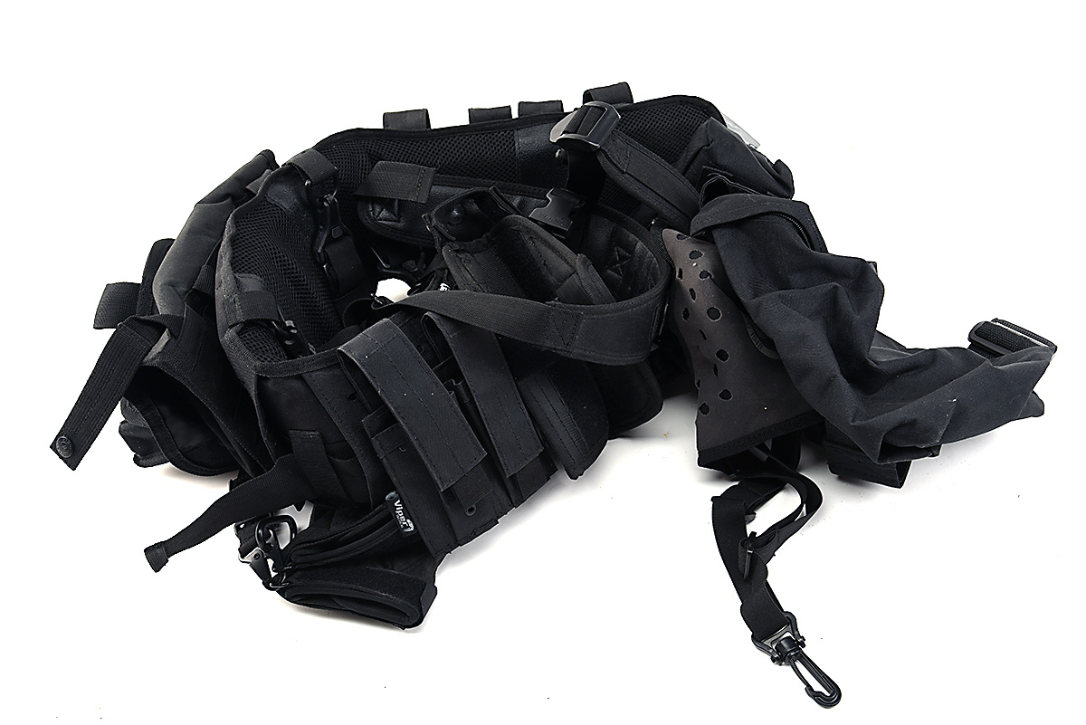 VIPER WEBBING WITH MEDICAL KIT & BUSHNELL BINOCULAR HARNESS, black Viper nylon webbing set, to include 3 x double 9mm magazine holders, 1 x drop leg dump pouch, 1 x first aid pouch c/w first aid kit, 1 x pistol holster;