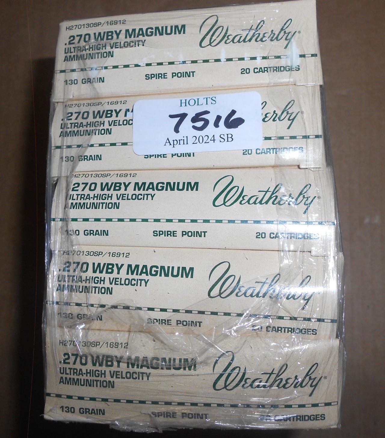 100 ROUNDS .270 WEATHERBY MAGNUM AMMUNITION, 130grn. SPIRE POINT Please be advised that cartridges/ammunition, primers, primed cases, blanks and percussion caps CANNOT BE SENT ANYWHERE in the UK or EXPORTED OVERSEAS by POST or CARRIER. Due to this NATIONAL and INTERNATIONAL CARRIER rule, within 30 days of the sale date, please arrange collection with our shipping department from our Norfolk HQ. If payment and collection is not arranged within 30 days of the sale date, that will indicate that the items are not required and they will be disposed of.