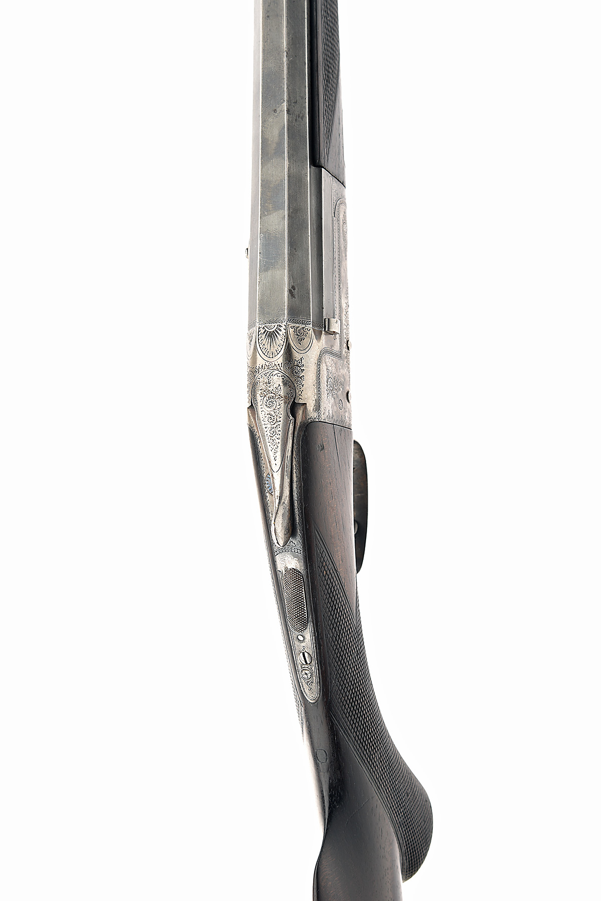 UNSIGNED .410 (SMOOTHBORED) SINGLE-BARRELLED TOPLEVER HAMMERLESS SHOTGUN, serial no. 1458, circa 1910, 27in. turned octagonal to round nitro barrel, rear-sight removed and dove-tail inserted, 2 1/2in. chamber, bored approx. 1/4 choke, automatic safety with inlaid 'SAFE' detail, tang cracked, action incorporating patent no. 19826, feathered border with fine acanthus scrollwork, retaining very slight traces of colour-hardening and finish, 14 1/2in. figured pistolgrip stock, with steel pistolgrip cap, Hackett-type snap-on splinter fore-end with horn finial, weight 4lb. 14oz.