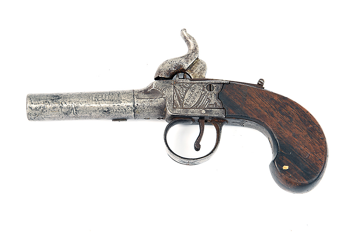 A .42 PERCUSSION BOXLOCK POCKET PISTOL BY WILLIAM PENN & CO. CIRCA 1815, no visible serial number, with 2 1/2 in turnoff barrel, boxlock action engraved with martial trophies and the retailers name 'WILLIAMS / PENN & CO.' central hammer with sliding bar safety, fitted with one piece walnut slab sided grips, the pistol was originally made as a flintlock circa 1815 and converted to percussion at a later date.