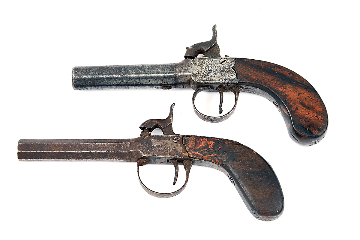 TWO PERCUSSION BOXLOCK POCKET PISTOLS, CIRCA 1840, no visible serial numbers,