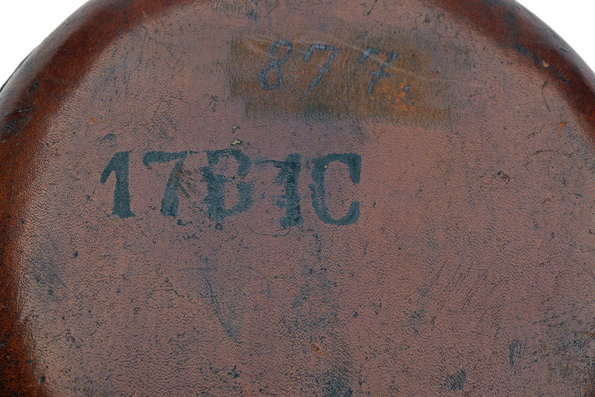 * A RARE DANISH GLASS ARMY MODEL 1856 WATER-BOTTLE, circa 1860, clear glass contained in a tightly sewn brown leather pouch together with original belt strap, marked on the reverse '874' and '17B1C', tight stitching, some staining to the leather, no chips to the rim, these canteens were not issued with caps, 6 in. diameter
