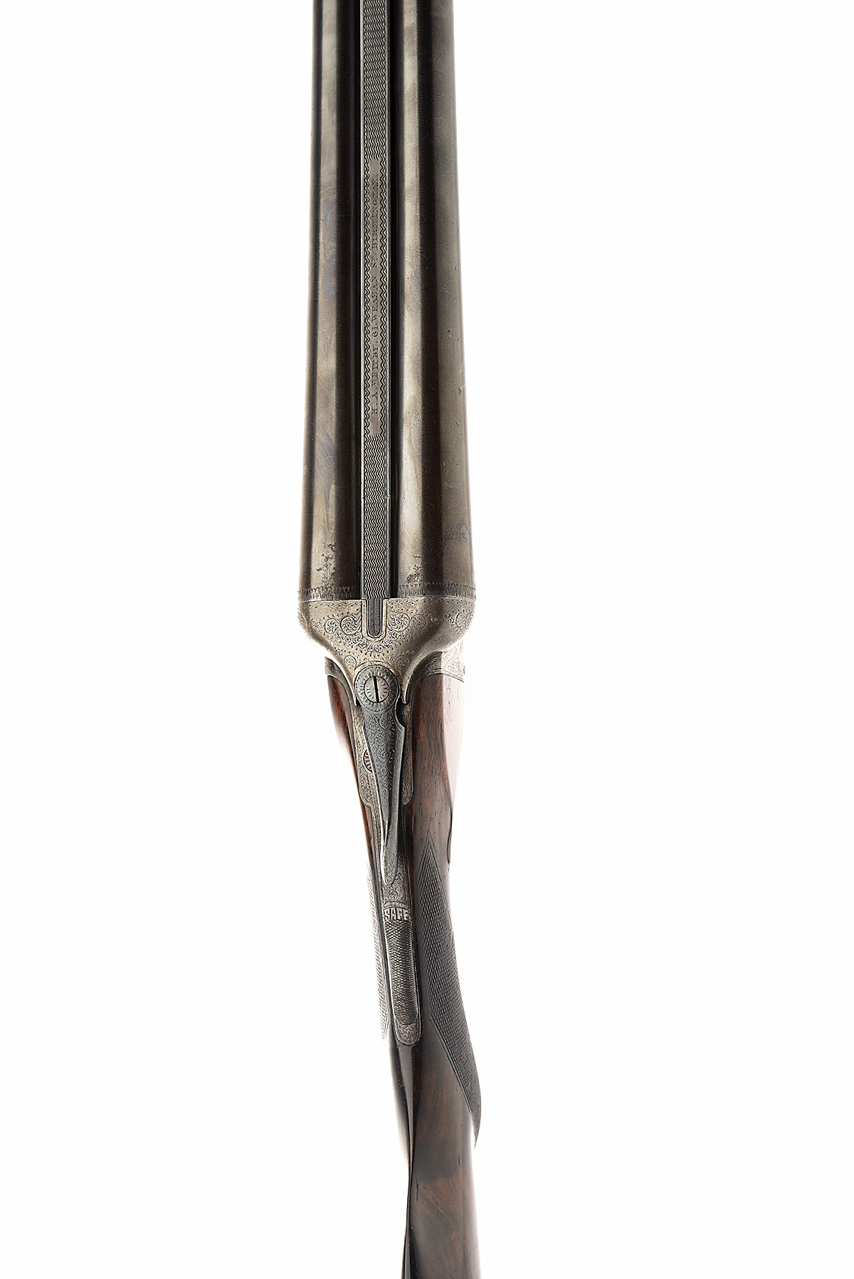 H.A. WHITBY 12-BORE BOXLOCK NON-EJECTOR, serial no. 1237, circa 1900, serial number to barrel loop only, 30in. nitro reproved barrels (dented), 2 1/2in. chambers, bored approx. imp. cyl. and 1/2 choke, treble-grip action, automatic safety, border and acanthus scroll engraving surrounding scenes of hound flushing game, retaining traces of original colour-hardening and finish, 14in. semi-pistolgrip stock including buttplate
