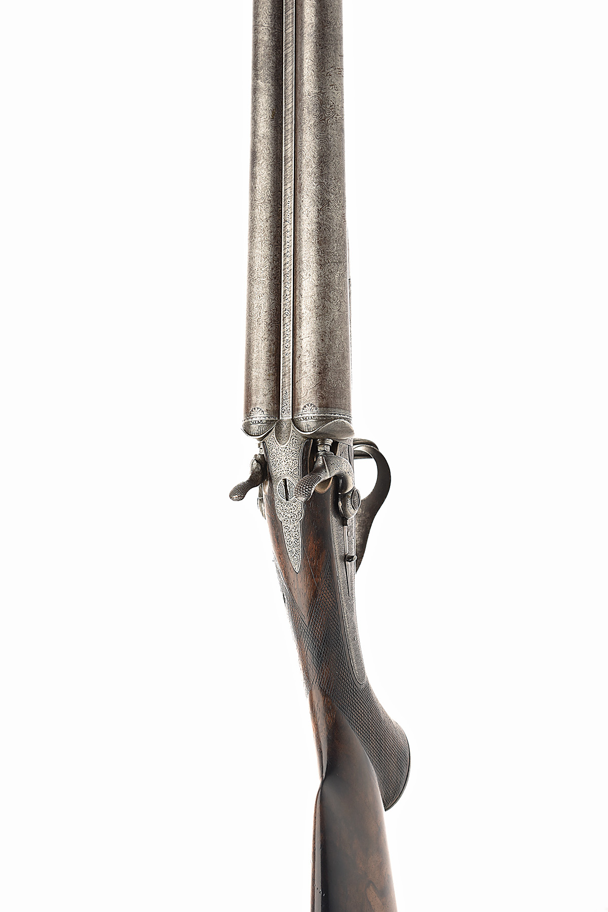 S. GRANT 16-BORE PURDEY 1863 (SECOND PATTERN) THUMBHOLE-UNDERLEVER HAMMERGUN, serial no. 2713, 27in. black powder only bold damascus barrels (pitted, left wall at 19), sunken rib engraved 'S. GRANT. 67A. ST. JAMES'S STREET. LONDON.', 2 1/2in. chambers, bored approx. true cyl. choke in both, possible conversion from pinfire, carved serpentine fences, non-rebounding back-action locks with bolted hammers of hare's-ear form (one replaced), Purdey patent thumbhole underlever, patent no. 1104 of 1863 (second pattern), use number 293, fine acanthus scroll engraving, retaining very slight traces of original colour-hardening, 14 1/2in. pistolgrip stock with engraved steel pistolgrip-cap and steel buttplate, insert repair at toe and plug (from removed sling eye), weight 5lb. 8oz.