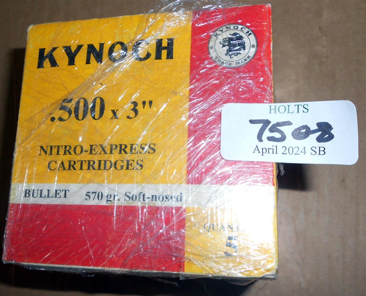20 ROUNDS .500 x 3in. NITRO EXPRESS AMMUNITION BY KYNAMCO, 570grn. SOFT NOSE Please be advised that cartridges/ammunition, primers, primed cases, blanks and percussion caps CANNOT BE SENT ANYWHERE in the UK or EXPORTED OVERSEAS by POST or CARRIER. Due to this NATIONAL and INTERNATIONAL CARRIER rule, within 30 days of the sale date, please arrange collection with our shipping department from our Norfolk HQ. If payment and collection is not arranged within 30 days of the sale date, that will indicate that the items are not required and they will be disposed of.