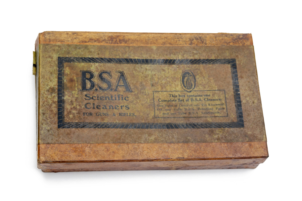 A RARE BOX OF B.S.A. SCIENTIFIC CLEANERS FOR GUNS & RIFLES, 1930s, hinged compartmented cardboard box containing four tubes of different types of cleaner with written instructions in the lid, box is complete and sturdy but soiled, the tubes retain original content and are perished but complete, requires careful handling and TLC