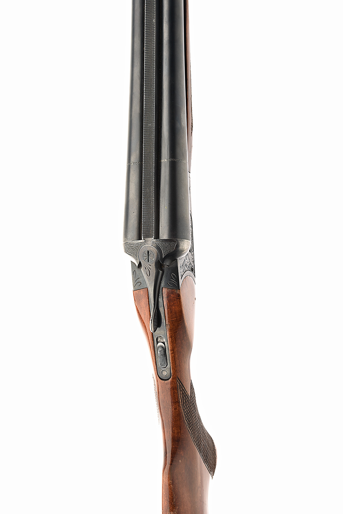 circa 1979, 28 5/8in. nitro reproved barrels with matt rib, 2 3/4in. chambers, bored approx. 1/2 and 3/4 choke, bird, hare and scroll engraving, black finish, 14 5/8in. pistolgrip stock
