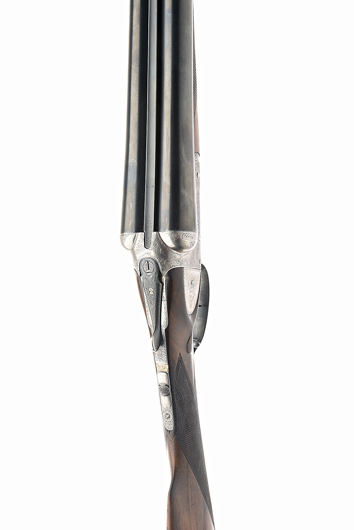 J.J. LANGLEY 12-BORE BOXLOCK EJECTOR, serial no. 1338, circa 1920, 27in. nitro reproved barrels (in 1975), 2 1/2in. chambers, bored approx. true cyl. and 1/2 choke, treble-grip action (bridge fractured), toplever gold-inlaid '2', automatic safety, border and partial scroll engraving, decorative sideplates engraved en suite, brushed finish, 14 5/8in. stock including 1 1/2in. wooden extension, weight 6lb. 11oz.