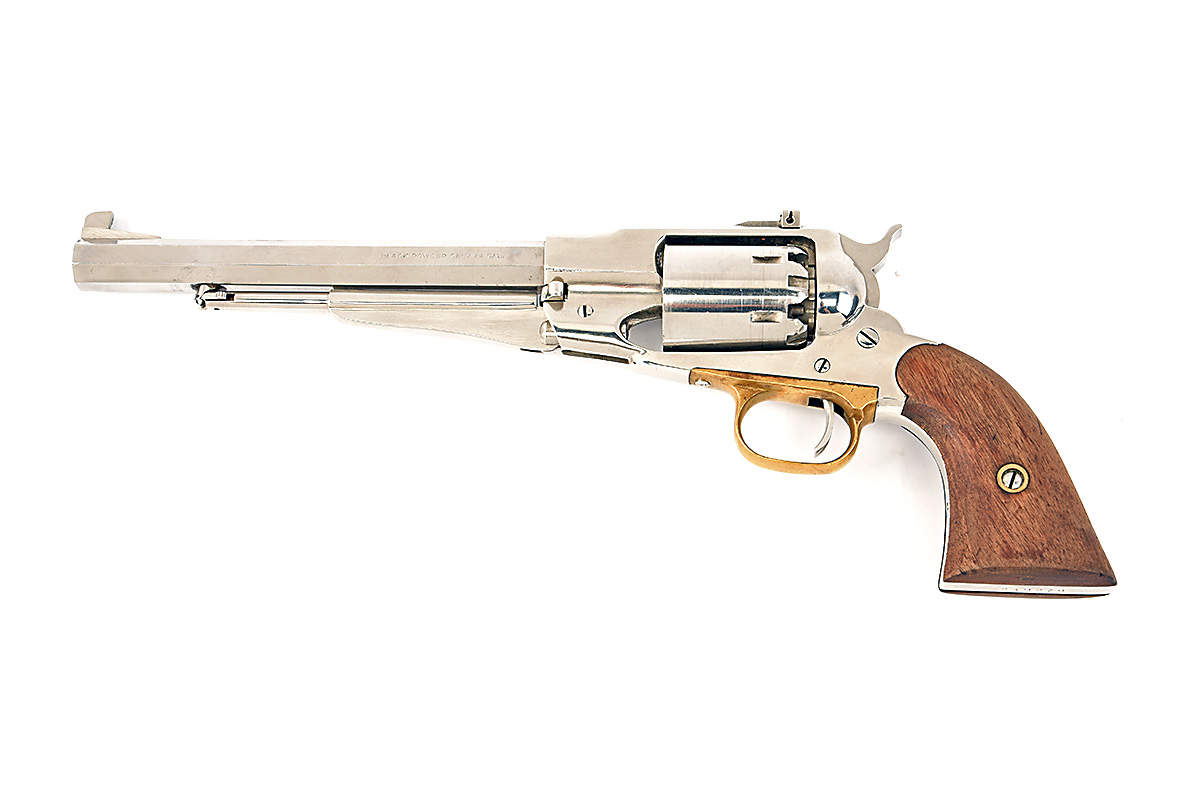 A REPRODUCTION PIETTA .44 PERCUSSION STAINLESS REMINGTON ARMY REVOLVER, serial no. 249279, with octagonal 8in. barrel, adjustable sights, plain cylinder , solid frame and smooth walnut grips