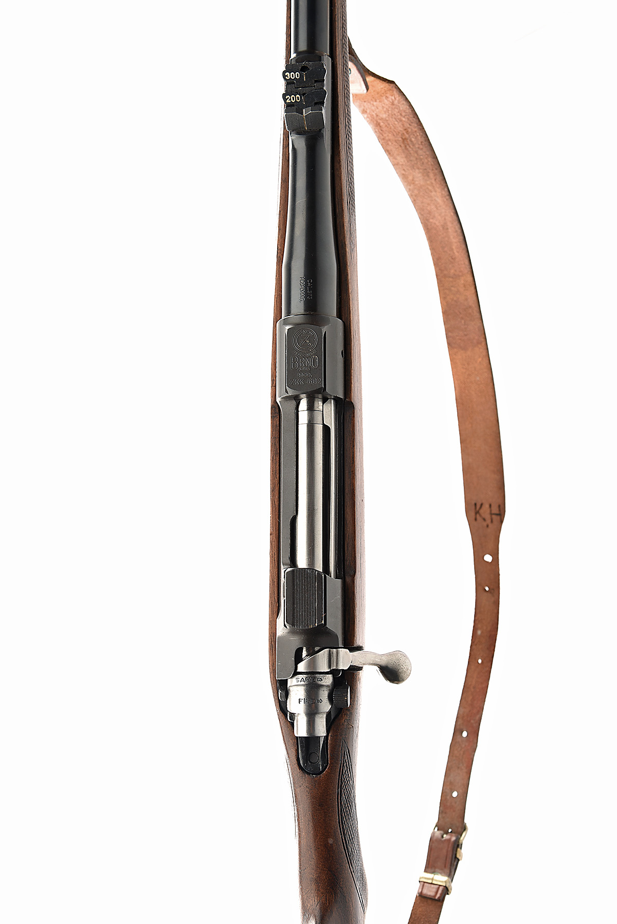 BRNO .375 H&H MAG. 'MOD ZKM-602' BOLT-MAGAZINE SPORTING RIFLE, serial no. 17989, circa 1991, 25 1/4in. nitro barrel, hooded ramp-mounted bead fore-sight, V rear-sight with 2 x folding sights, manual safety, hinged floorplate, well-figured pistolgrip stock, leather sling