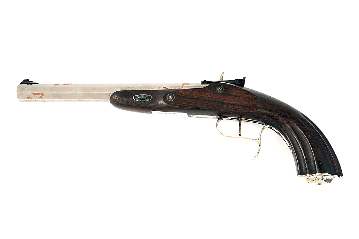 A REPRODUCTION ARMI SPORT .45 PERCUSSION 'LE-PAGE' PISTOL, serial no. L71622, with in the white octagonal 9 3/4in. barrel retro-fitted with later adjustable sights, engraved bar-action lock, walnut half-stock with fluted grip and replacement trigger