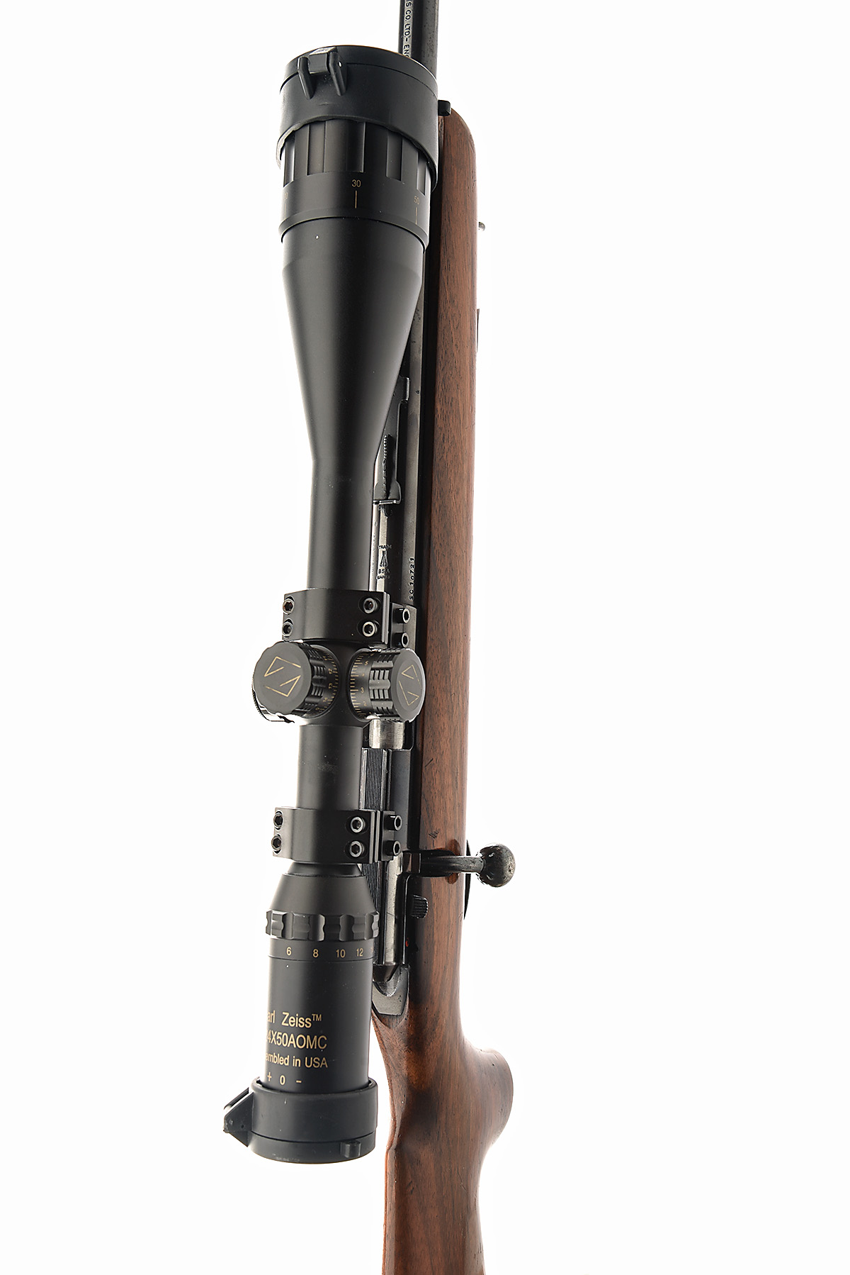 B.S.A. .22 L.R. 'SUPERSPORT-FIVE' BOLT-MAGAZINE SPORTING RIFLE, serial no. SC10721, circa 1966, 22 1/2in. nitro barrel, ramp-mounted bead fore-sight, leaf rear-sight, fitted with a telescopic sight spuriously marked Carl Zeiss 6-24x50 AOMC, manual safety, detachable magazine, pistolgrip stock with cheekpiece, sling swivels