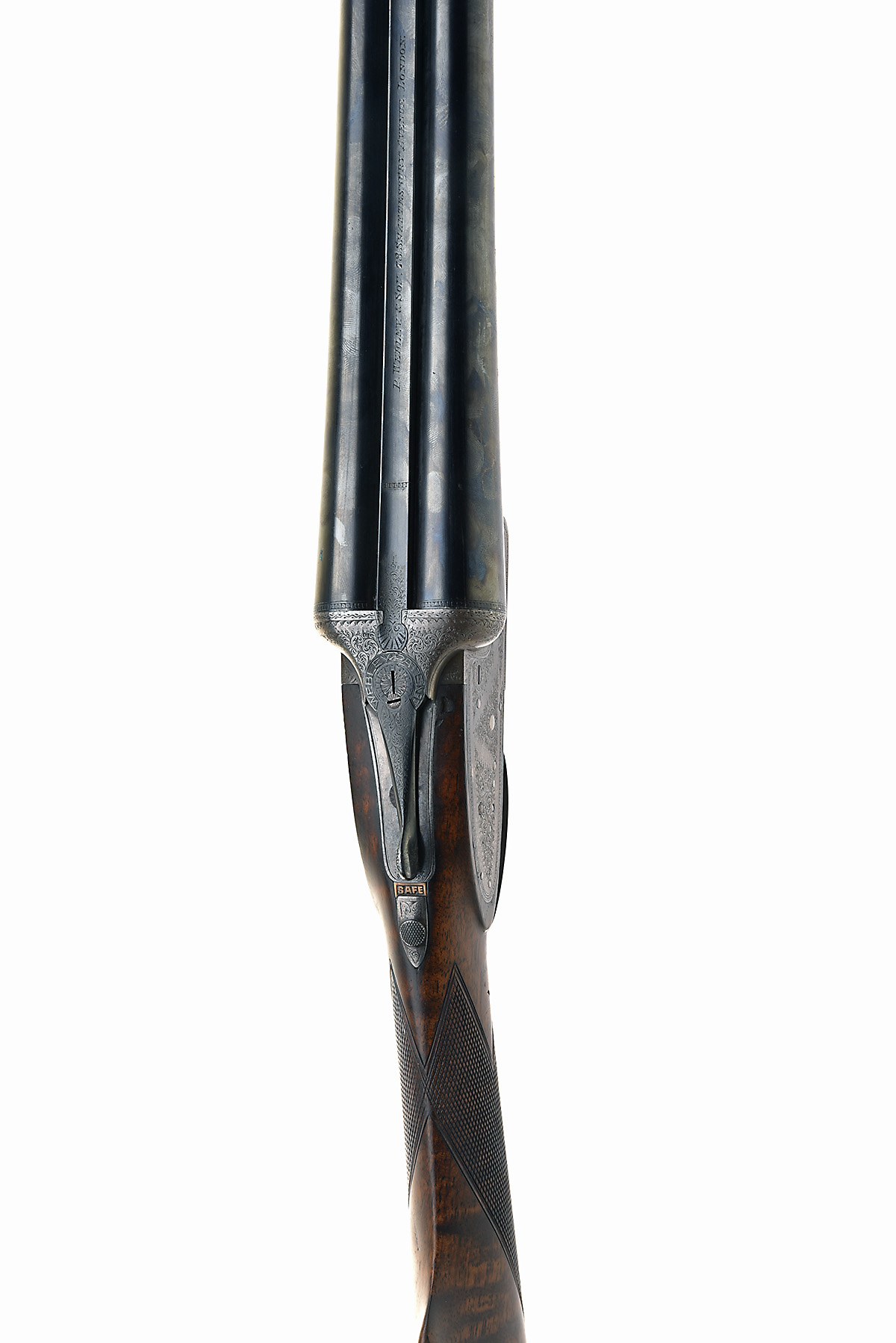 P. WEBLEY & SON 12-BORE SIDELOCK EJECTOR, serial no. 57082, circa 1900, 30in. nitro barrels, the rib engraved 'P. WEBLEY & SON. 78 SHAFTESBURY AVENUE. LONDON.', 2 1/2in. chambers, bored approx. true cyl. and 3/4 choke, some dents, treble-grip action with slender 'WEBLEY PATENT' toplever, automatic safety with brass 'SAFE' plaque, acanthus scroll engraving with beaded bordering, 15 1/2in. figured stock including buttplate, weight 6lb. 11oz.