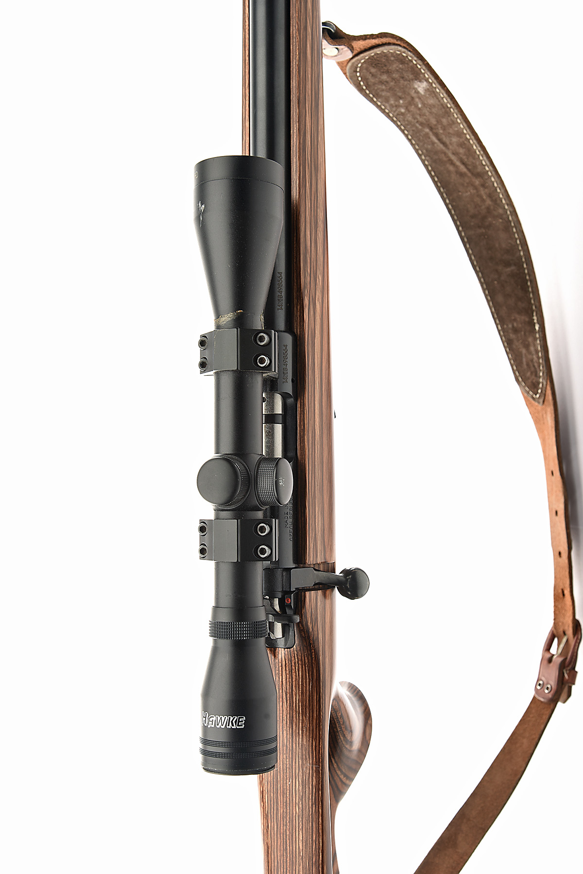 CZ .22 L.R. '455' BOLT-MAGAZINE SPORTING RIFLE, serial no. B498564, circa 2014, 17 1/4in. unsighted nitro barrel, threaded for sound moderator, fitted with a Hawke 4x40 telescopic sight, manual safety, detachable magazine, laminated thumbhole stock with recoil pad and cheekpiece, leather sling