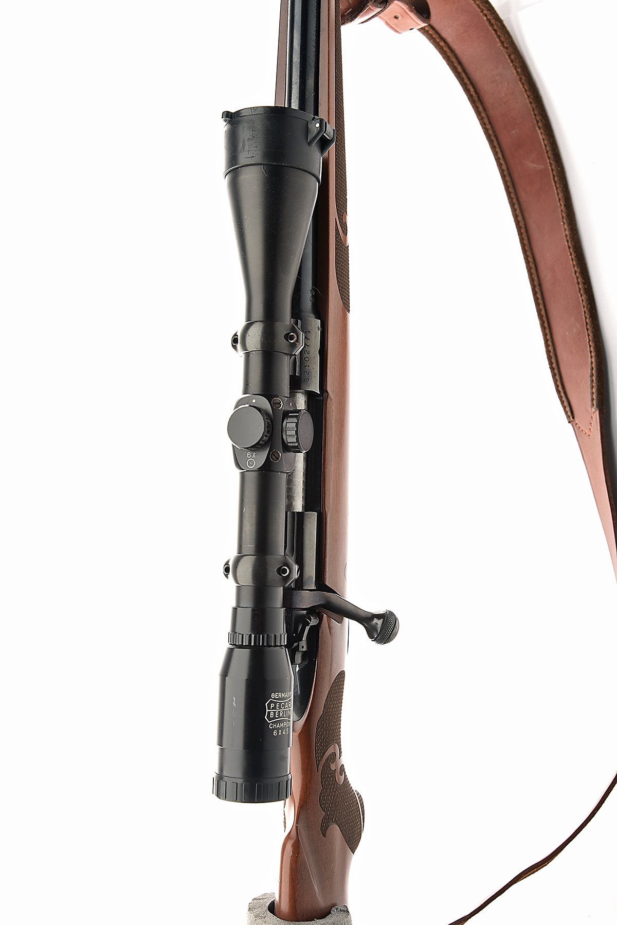 WINCHESTER .243 WIN. 'MODEL 70' BOLT-MAGAZINE SPORTING RIFLE, serial no. G2102771, circa 1991, 22in. unsighted nitro barrel, fitted with a Pecar Berlin 6x45 telescopic sight, manual safety, hinged floorplate, pistolgrip stock, leather suede-lined sling