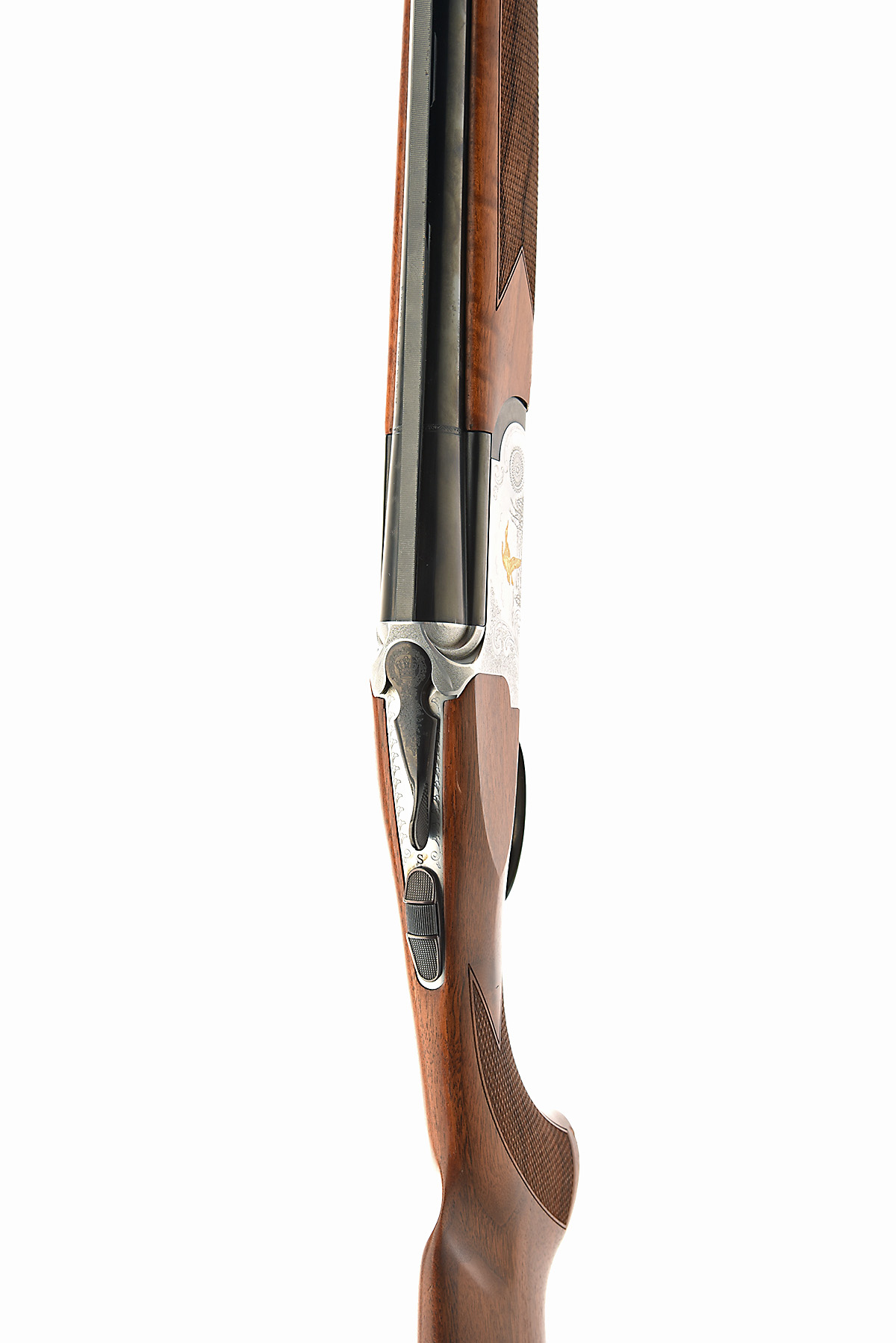 LINCOLN 16-BORE 'PREMIER' SINGLE-TRIGGER OVER AND UNDER EJECTOR, serial no. 268585, dated 2012, 28in. nitro reproved barrels (in 2024) with 6mm ventilated matt top-rib, 2 3/4in. chambers, multichokes (no spares), hold-open toplever, automatic safety with integral barrel selector switch, gold-washed single trigger, acanthus scroll engraving surrounding gold-highlighted game scenes, 14 1/2in. pistolgrip stock including buttplate, weight 6lb. 3oz.
