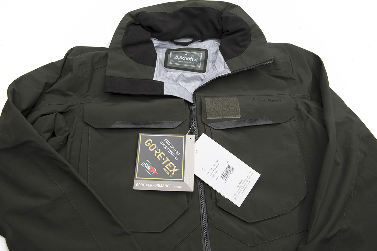 NEW & UNUSED SCHOFFEL SALAR II WADING FLY FISHING JACKET (WITH TAGS), SIZE UK 40, EU 50/L, US 40, ASIA XL GORE-TEX® 3-layer laminate, water column: >28,000mm, breathability: RET <9 PA m2/W; one-way YKK front zip; hand warming pockets; internal security pocket, three-point adjustable packaway storm hood with peak, reinforced net D-ring at rear velcro fly patch pad wading belt loops, machine washable