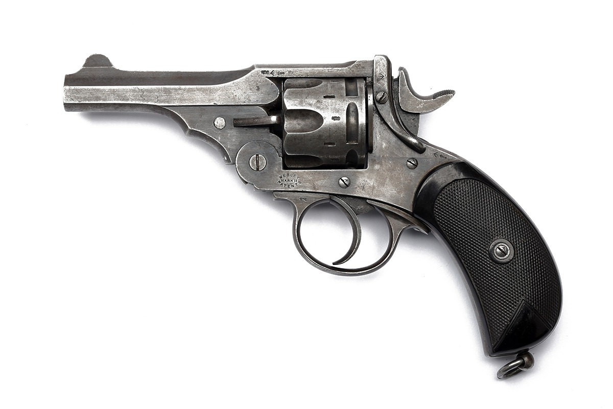 * A .455 WEBLEY & SCOTT MKII SERVICE-REVOLVER, serial no. 63666, with faded blue 4in. barrel, break-open frame with automatic ejecting fluted six-shot cylinder with narrow locking notches and broad hammer spur,, chequered hard rubber birdshead grips and lanyard ring at heel, with certificate of proof
