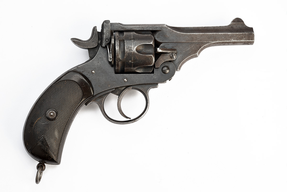 * A .455 WEBLEY & SCOTT MKIII SERVICE-REVOLVER, serial no. 76486, with blued 4in. barrel, break-open frame with automatic ejecting fluted six-shot cylinder, chequered hard rubber birdshead grips and lanyard ring at heel, with certificate of proof