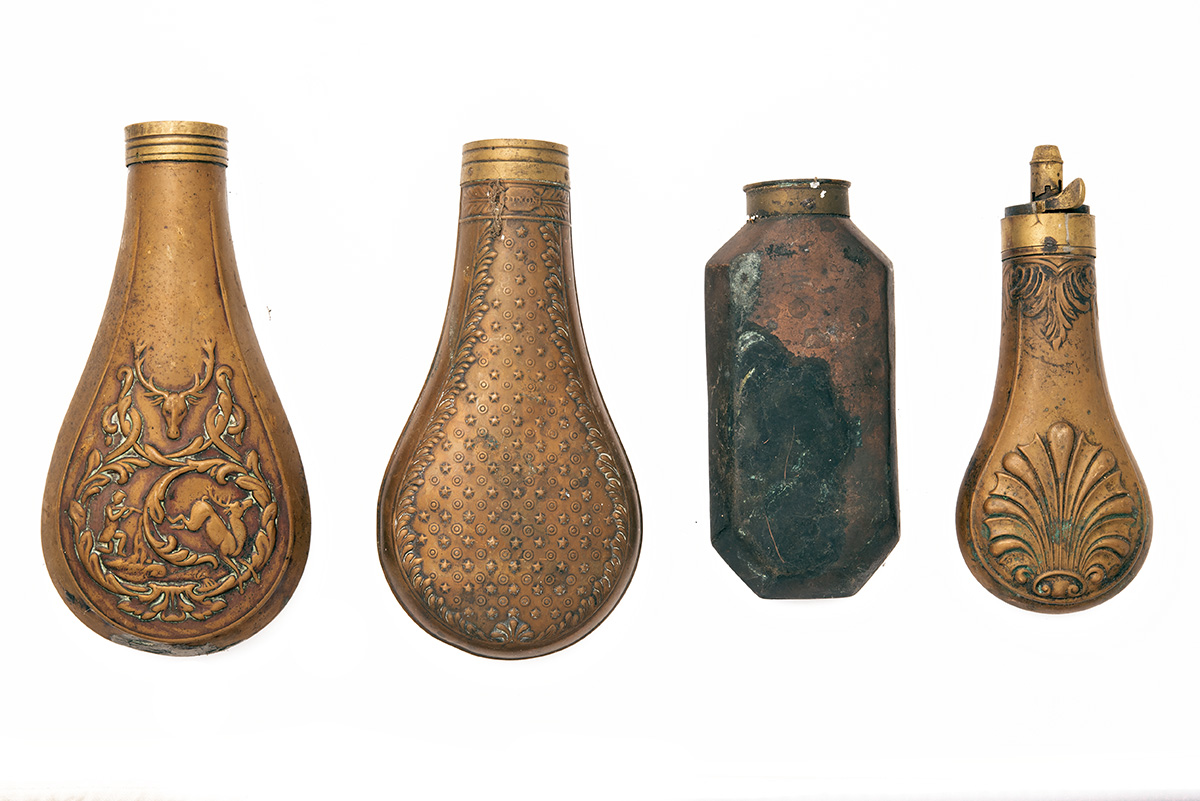 A GROUP OF 10 POWDER FLASKS FOR SPORTING GUNS, 19th Century, all with faults and in very mixed condition