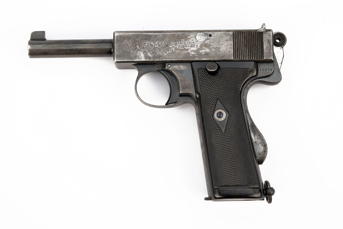 A WEBLEY & SCOTT .455 MKI SEMI-AUTOMATIC PISTOL, serial no. 116979, dated for 1913 and also bearing a South African registration number to slide, with exposed 5in. barrel, exposed ring hammer, frame with grip safety and chequered hard rubber grips, finish thin and lost