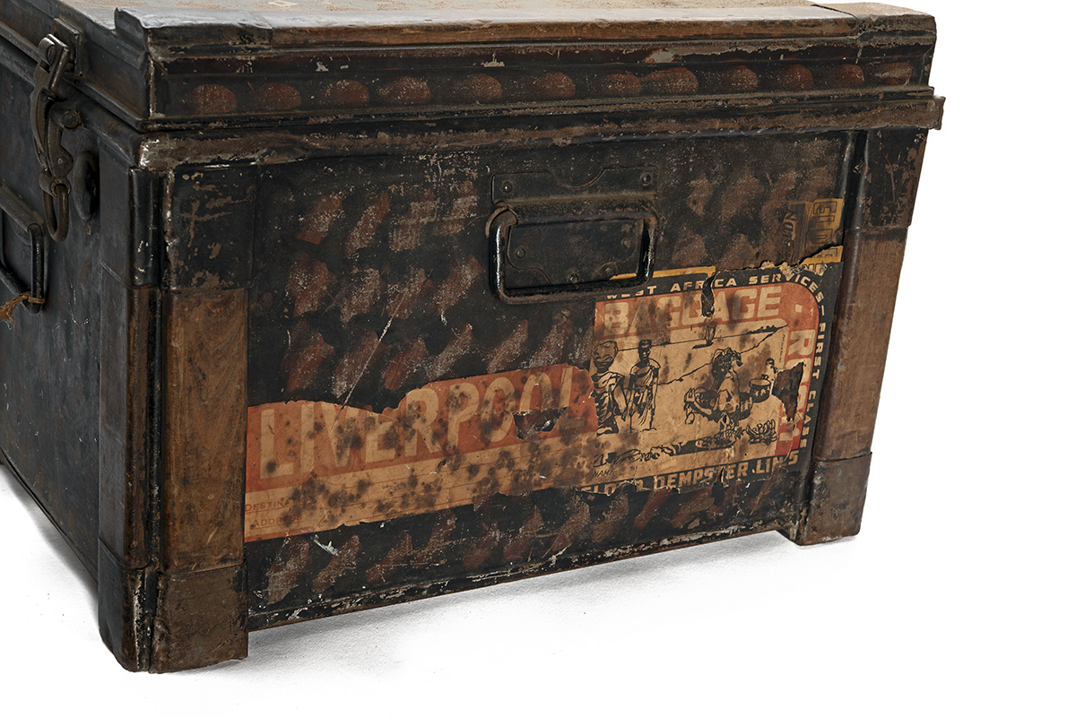 A LARGE WELL-MADE WOOD AND STEEL TRANSPORTATION CASE, late 19th-early 20th Century, probably for military uniforms, japanned interior, teak strapping, with labels for Liverpool to West Africa via Elder Dempster lines, solidly constructed without any apparent seam-spliting, complete with catches, lock removed, a quality piece in its time, 37 in. x 13 in. x 19 in.; Elder Dempster was the largest shipping company trading between Europe and West Africa from the late 19th century to the 1980s