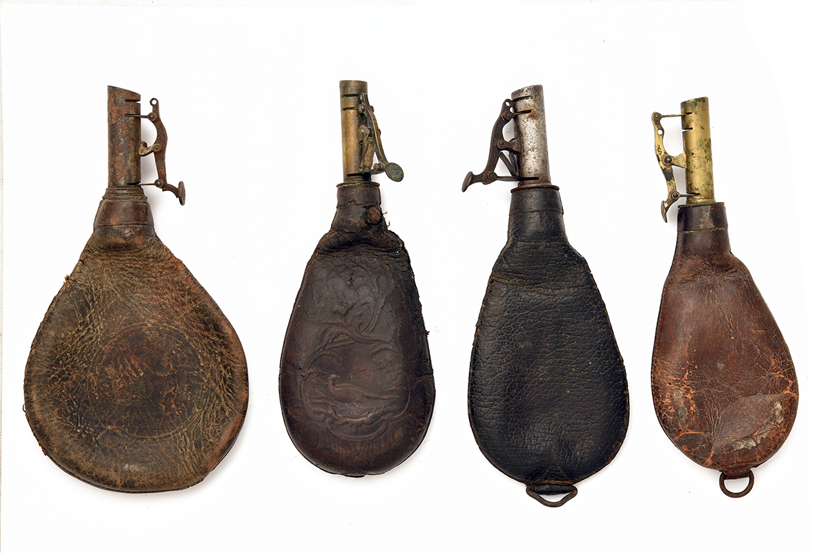 A MIXED GROUP OF 15 SHOT FLASKS FOR PARTS OR RESTORATION, mixed periods and in a very mixed condition, worn with broken springs, cut-offs and stitching, etc.
