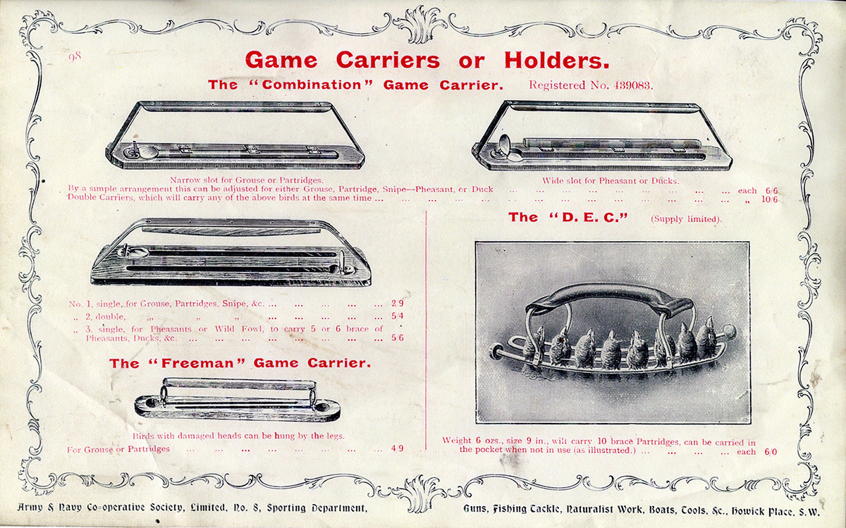 A GROUP OF FIVE RARE GAME CARRIERS BY JAMES DIXON & SONS, circa late 19th Century, 1) rare steel Jonas's Patent 'Simplex', unmarked but retailed by Dixon and appearing in their period catalogues; 2) rare Combination double-carrier, with hinged slots to allow smaller game to be held, both hinged gates marked 'JAMES DIXON / & SONS / SHEFFIELD' with trumpet and banner trade-mark, leather strap deteriorated and broken at one end, some worming; 3) a double-carrier with horizontal screw gates marked 'JAMES DIXON / & SONS / SHEFFIELD'; 4) a double-carrier with both hinged gates marked 'JAMES DIXON / & SONS / SHEFFIELD' with trumpet and banner trade-mark, some worming; 5) single carrier with hinged gate marked 'JAMES DIXON / & SONS / SHEFFIELD' with trumpet and banner trade-mark; NB - this trademark was used between 1879-1890