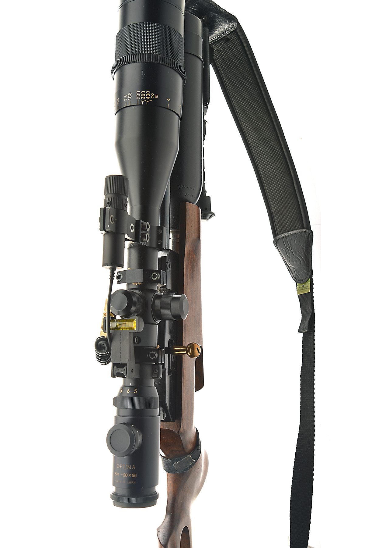 AN FAC-RATED THEOBEN RAPID 12 .22 PRE-CHARGED PNEUMATIC AIR-RIFLE, serial no. 000044, early version with blued 22in. barrel including built-on Vortex sound moderator, blued bolt-action receiver with brass magazine buttresses (magazine absent) and an applied brass plaque reading 'THEOBEN RAPID 12/22', under-barrel cylinder air-reservoir and skeletal walnut half-stock, fitted with an Optima 5-20x56 telescopic sight, a laser, a spirit lever, a Harris style bipod and a padded nylon sling, tested, together with two filling hoses and a vinyl cover