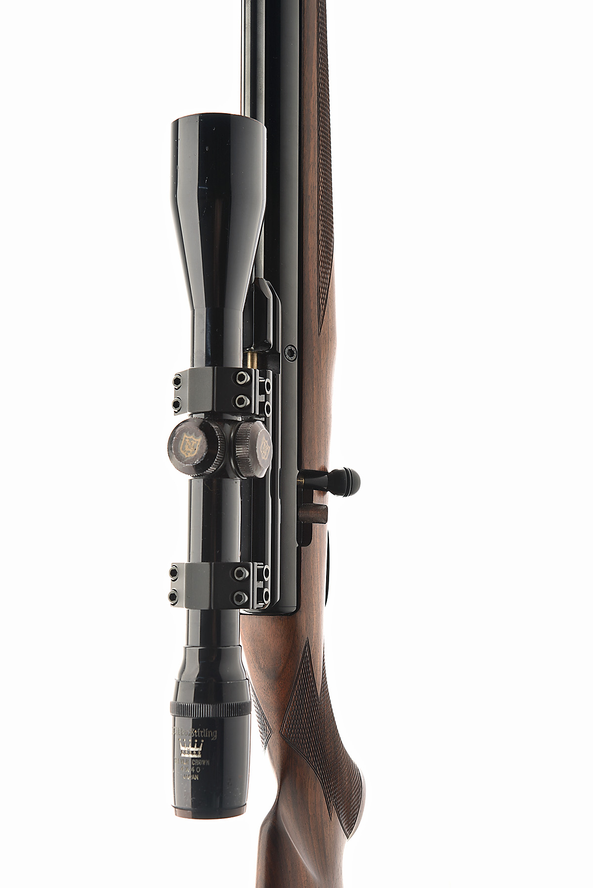 A .22 PRE-CHARGED PNEUMATIC AIR-RIFLE, SIGNED RWS 'MODEL EXCALIBRE', serial no. 06339, 24 3/4in. barrel including sound moderator, receiver fitted with a Nikko Stirling silver crown 4x40 telescopic sight, bolt-action, detachable rotary magazine with spare, blacked finish, chequered walnut pistolgrip stock with cheekpiece, 14 1/2in. pull including ventilated rubber recoil pad, in its makers ABS case with some pellets