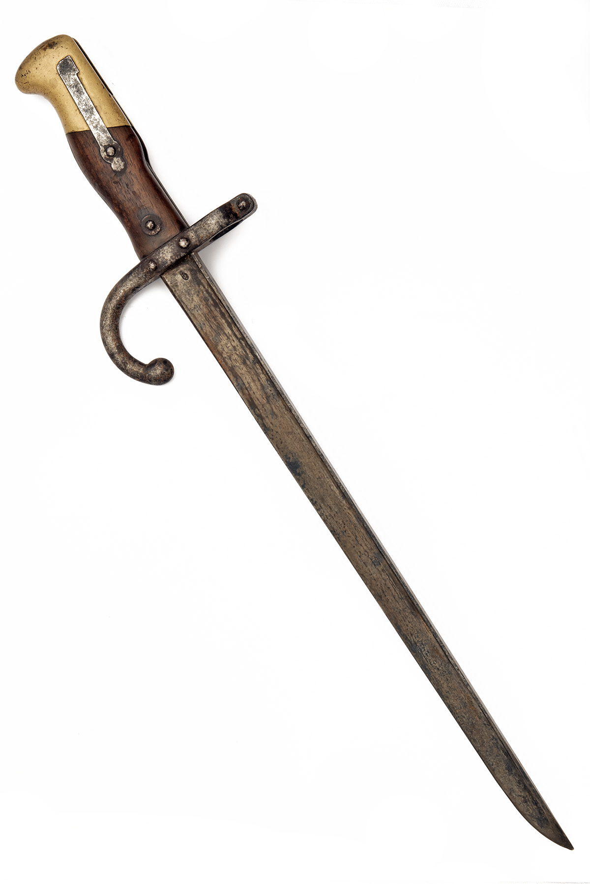 A MIXED GROUP OF SIX BAYONETS AND A KNIFE, includes World War II No. 4 Mark III and Mark II bayonets for the SMLE, a shortened French Model 1874, two German Model 1884/98 Mauser bayonets missing grips and release studs, a Siamese Type 46 bayonet with losses to grips, plus a rusted tourist knife