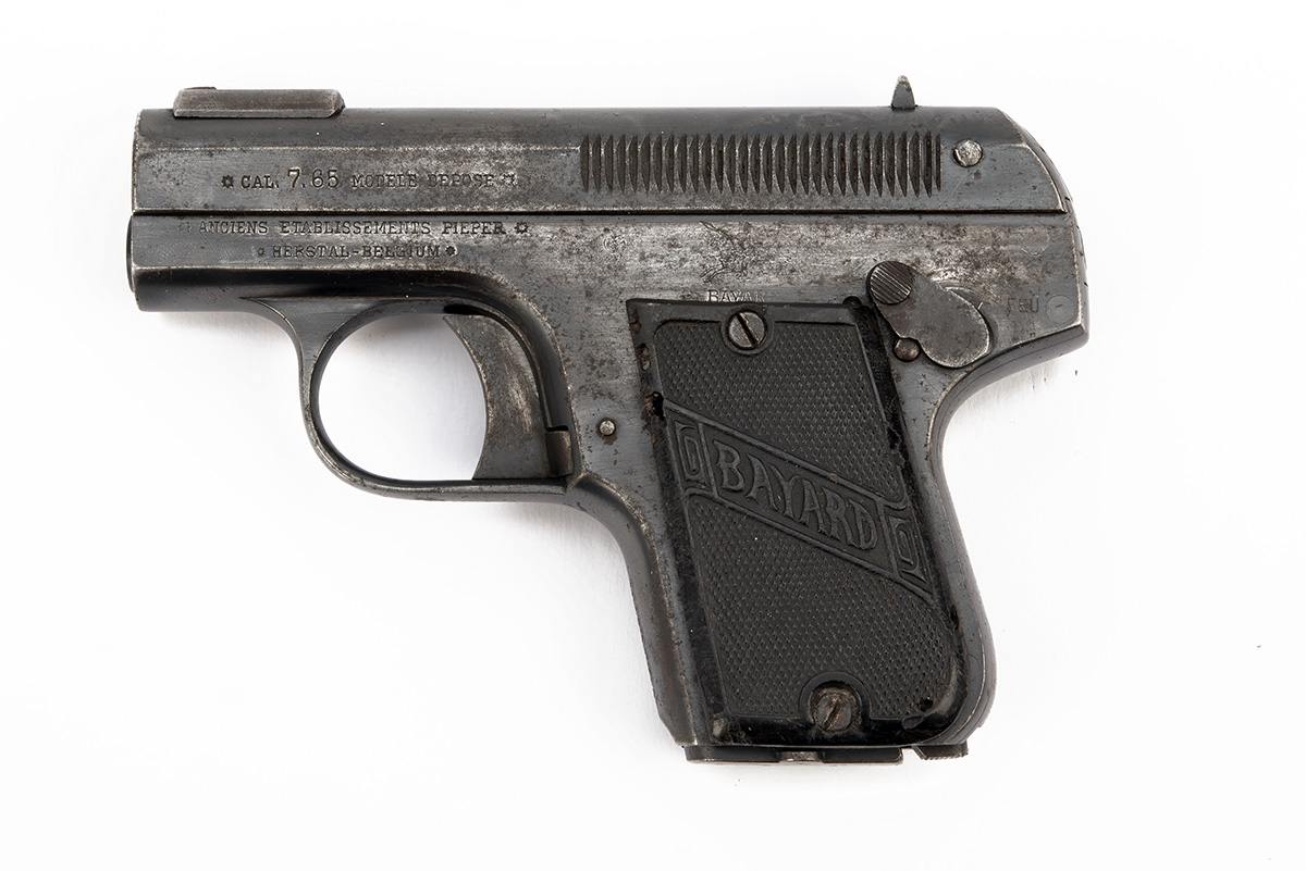 A .32 ACP (7.65mm) BAYARD SEMI AUTOMATIC POCKET PISTOL, serial no. 171617, with frame mounted 2 1/4in. barrel, blued slide and frame, chequered hard rubber grips and much original finish