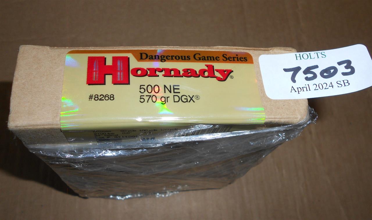 6 ROUNDS .500 NITRO EXPRESS AMMUNITION BY HORNADY, 570grn DGX, SOFT NOSE #8268, BATCH 38268/6 Please be advised that cartridges/ammunition, primers, primed cases, blanks and percussion caps CANNOT BE SENT ANYWHERE in the UK or EXPORTED OVERSEAS by POST or CARRIER. Due to this NATIONAL and INTERNATIONAL CARRIER rule, within 30 days of the sale date, please arrange collection with our shipping department from our Norfolk HQ. If payment and collection is not arranged within 30 days of the sale date, that will indicate that the items are not required and they will be disposed of.
