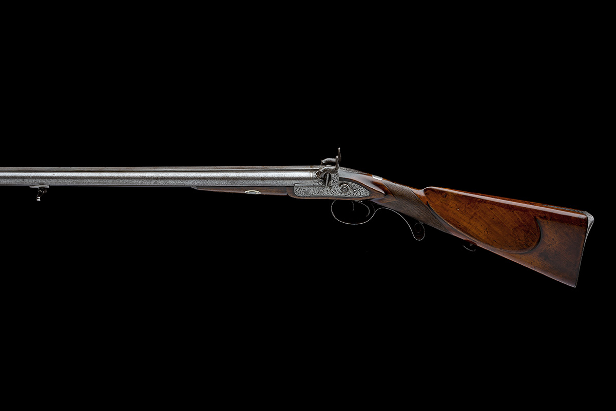 circa 1840, with ribbon-twist damascus 32in. barrels mounted with a raised flat rose damascus rib, scroll engraved rib-end and engraved and moulded breech-blocks further inlaid with white metal bands, borderline and scroll engraved top-tang, border and scroll engraved bar-action locks, the right signed 'DELCOMYN' and additionally engraved with deer, the left signed 'KIOBENHAVN' and further engraved with a hunting dog, walnut half-stock chequered at the wrist and with raised cheek-piece, engraved iron furniture and horn-tipped ebony ramrod