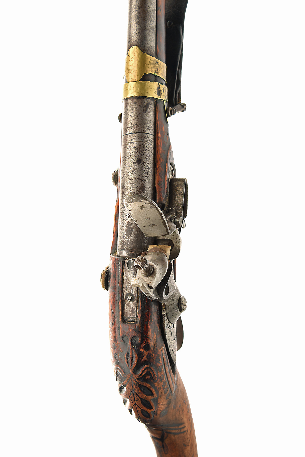 * AN INDO-PERSIAN 20-BORE FLINTLOCK CAMEL-GUN WITH EAST INDIA COMPANY LOCK SIGNED MEMORY, no visible serial number, circa 1820, with 45 1/2in. barrel swelling at the muzzle, re-purposed lock from a Brown Bess musket with East India Company heart trade-mark at tail, dated 1779 and signed 'MEMORY' (lock loose), hardwood full-stock with exaggerated curved butt, horn and bone heel-pad and mixed metal furniture, fitted with a period leather sling