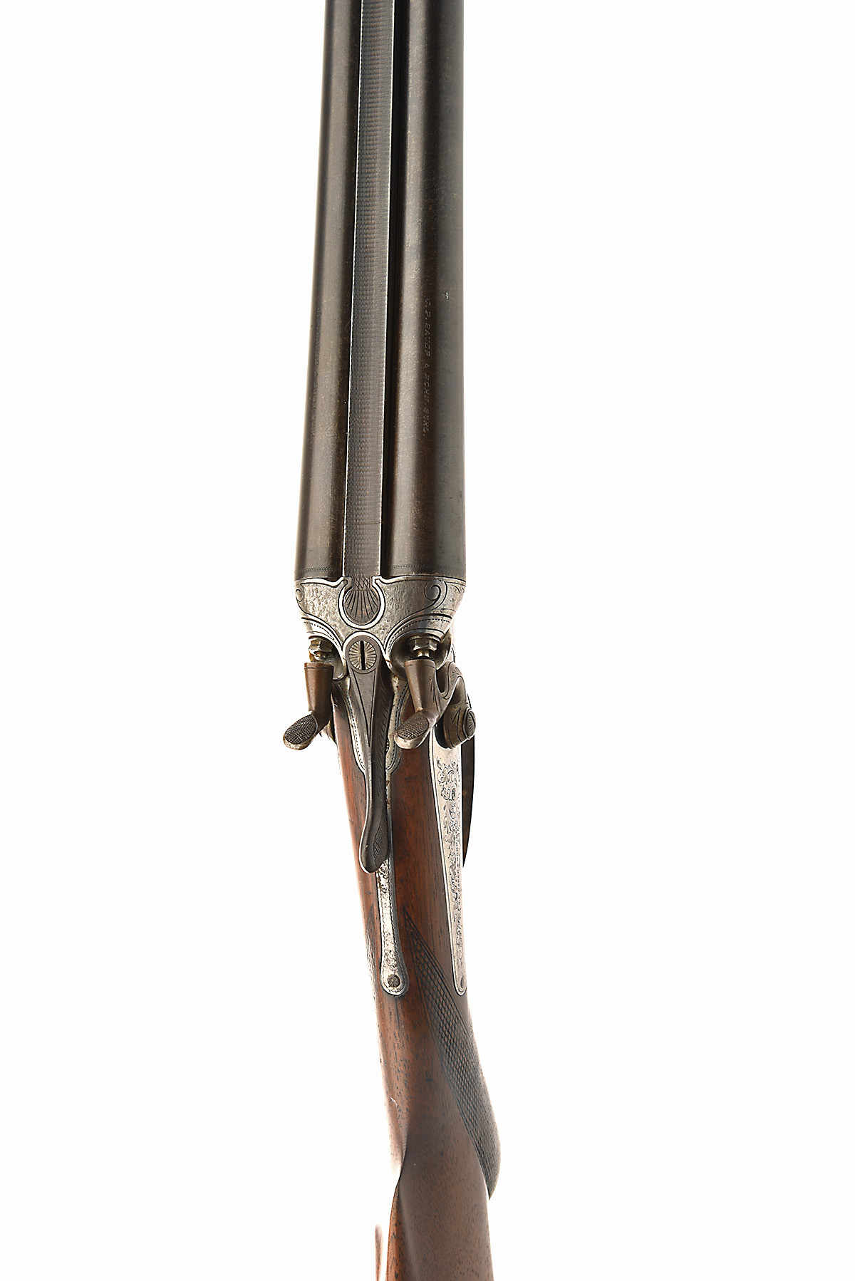 * J.P. SAUER & SOHN - SUHL 16-BORE TOPLEVER HAMMERGUN, serial no. 74418, circa 1900, 29in. black powder only damascus barrels (pitted), the tubes engraved 'J.P. SAUER & SOHN, SUHL.', 2 1/2in. chambers, bored approx. 1/4 and 3/4 choke, carved percussion fences, treble-grip action, rebounding back-action sidelocks, border and partial acanthus scroll engraving, bright finish, 14in. pistolgrip stock with cheekpiece, pistolgrip cap, sling swivels, including buttplate
