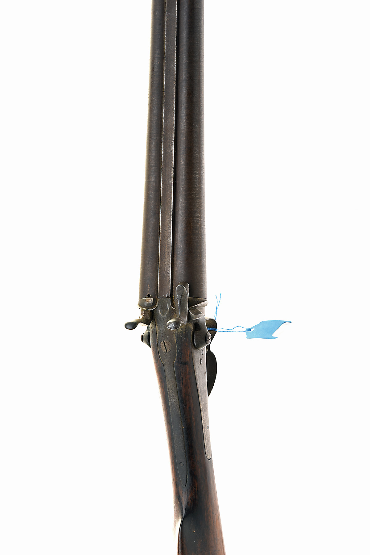 * A 12-BORE PINFIRE CONTINENTAL DOUBLE-BARRELLED HAMMER-GUN UNSIGNED, serial no. 806, circa 1875, with 29 3/4in. browned barrels, Lefaucheux style action with forward facing under-lever, plain back-action locks (one hammer nose absent), walnut butt-stock and captive iron fore-end