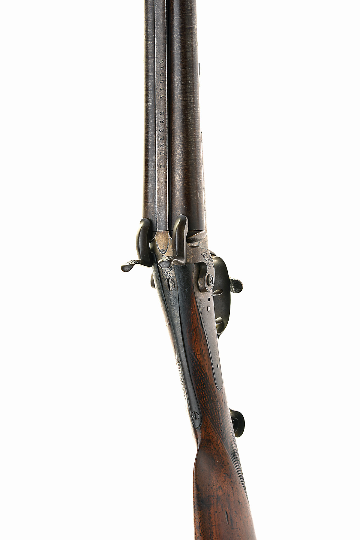 * A 16-BORE PINFIRE DOUBLE-BARRELLED SPORTING-GUN SIGNED H. HANSON, VIBORG, serial no. 13900, Belgian, circa 1868, with wire damascus 30 3/4in. barrels (rusted externally), plain side-lever opening frame and border engraved locks, chequered walnut butt-stock and splinter fore-end