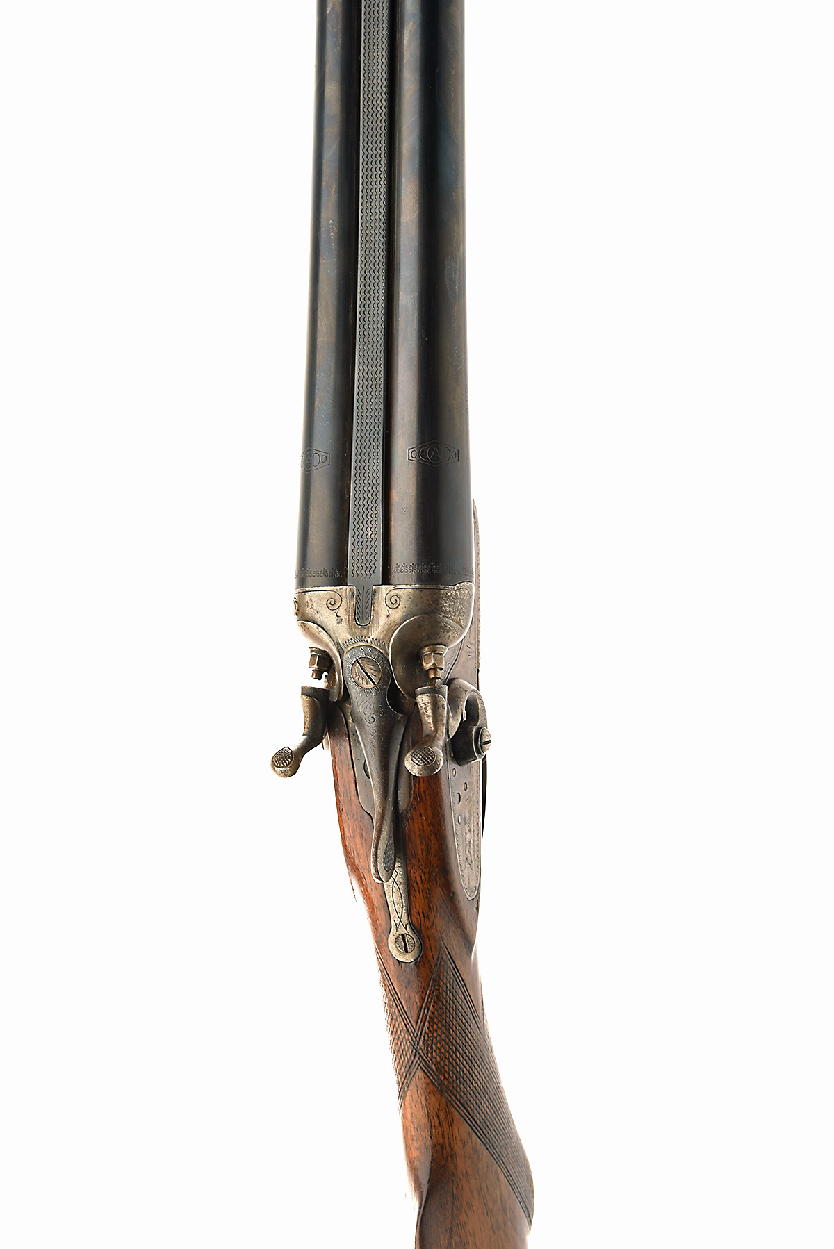 ** GECADO 12-BORE TOPLEVER HAMMERGUN, serial no. 50703, for 1932, 30in. nitro barrels with file-cut matt rib, the tubes engraved 'GECADO', 2 3/4in. chambers, bored approx. true cyl. and 3/4 choke, treble-grip action with side-clips, bar-action locks with rebounding c-scroll hammers, border engraving with naive game-scenes, retaining some original colour-hardening and finish, 14 1/4in. semi-pistolgrip stock, with cheekpiece, including buttplate