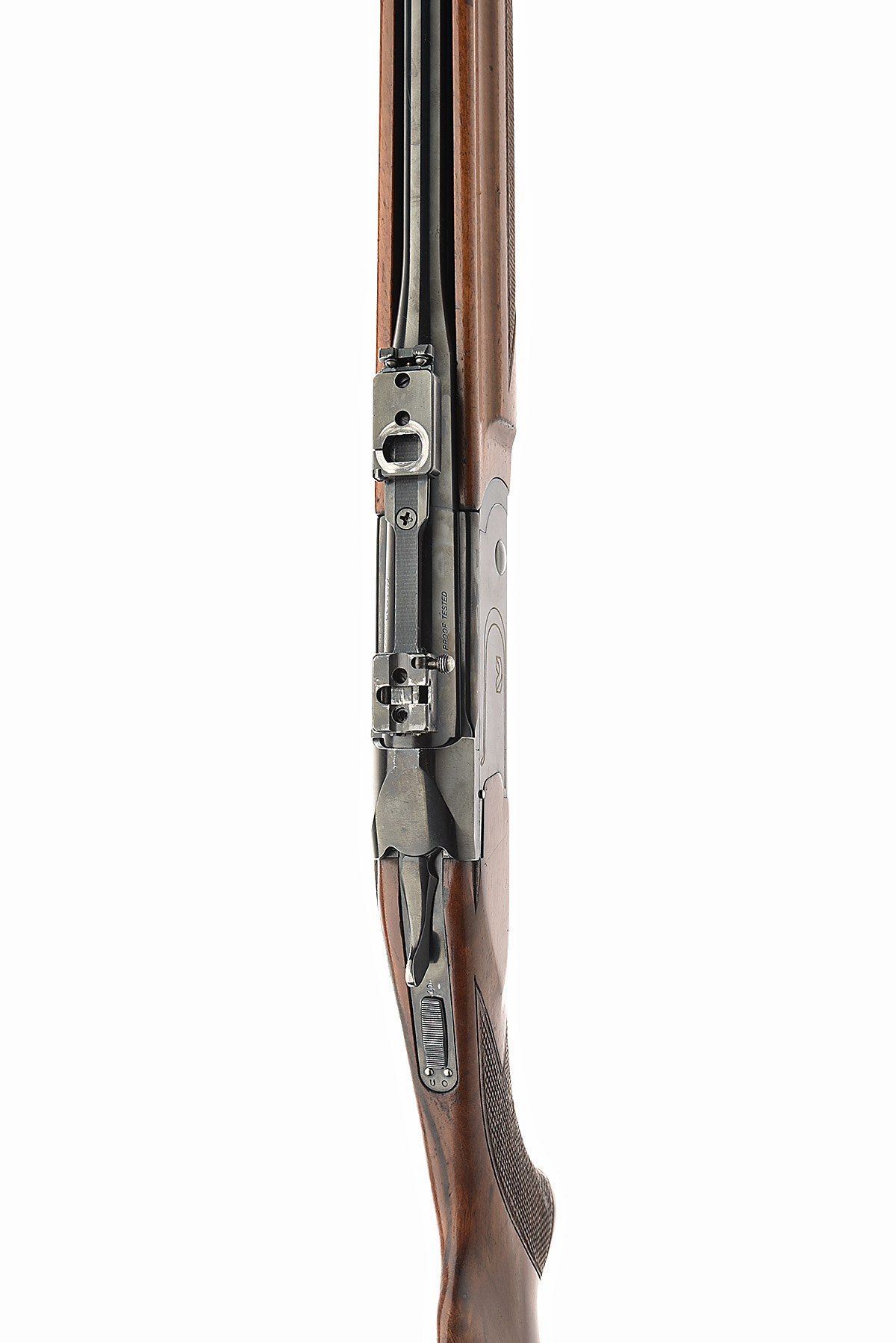 23 1/2in. nitro barrel, ramp-mounted blade fore-sight, no rear-sight, tapped for apel mounts, manual tang safety, barrel selector, pistolgrip stock with ventilated recoil pad, sling eyes