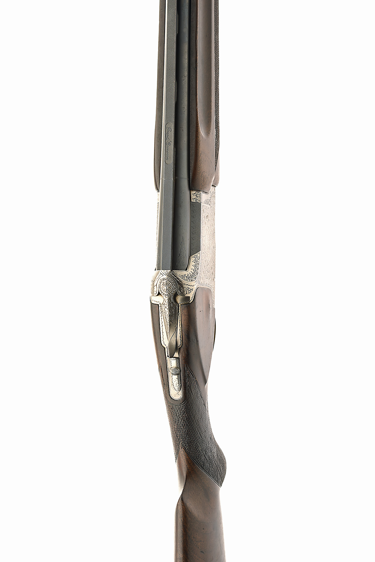 circa 1984, 28in. nitro reproved barrels (in 2024), with 6mm ventilated matt top-rib, 2 3/4in. chambers, bored approx. 1/4 and 1/2 choke, hold-open toplever, manual safety with integral barrel-selector switch, acanthus scroll engraving with floral bouquets, bright finish, 14 1/4in. semi-pistolgrip stock including buttplate, weight 7lb. 3oz.